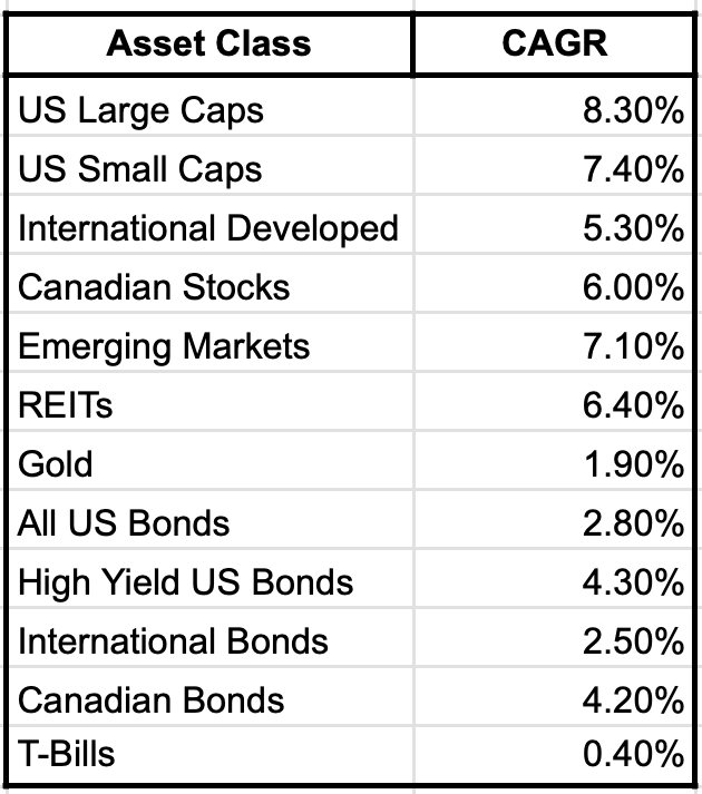There are many studies that look at the historical rate of return of different asset types. Looking at a study that looked back at data from 1985 to 2023, taking into account US inflation data and assuming that all dividends were reinvested, US Large Cap stocks (S&P 500) has performed the best at an annual rate of 8.3%. The second best asset class has been US Small Cap stocks returning 7.4% annually. Canadian stocks have returned 6% annually, and REITs have returned 6.4%. Listed below is every asset class in the study.
